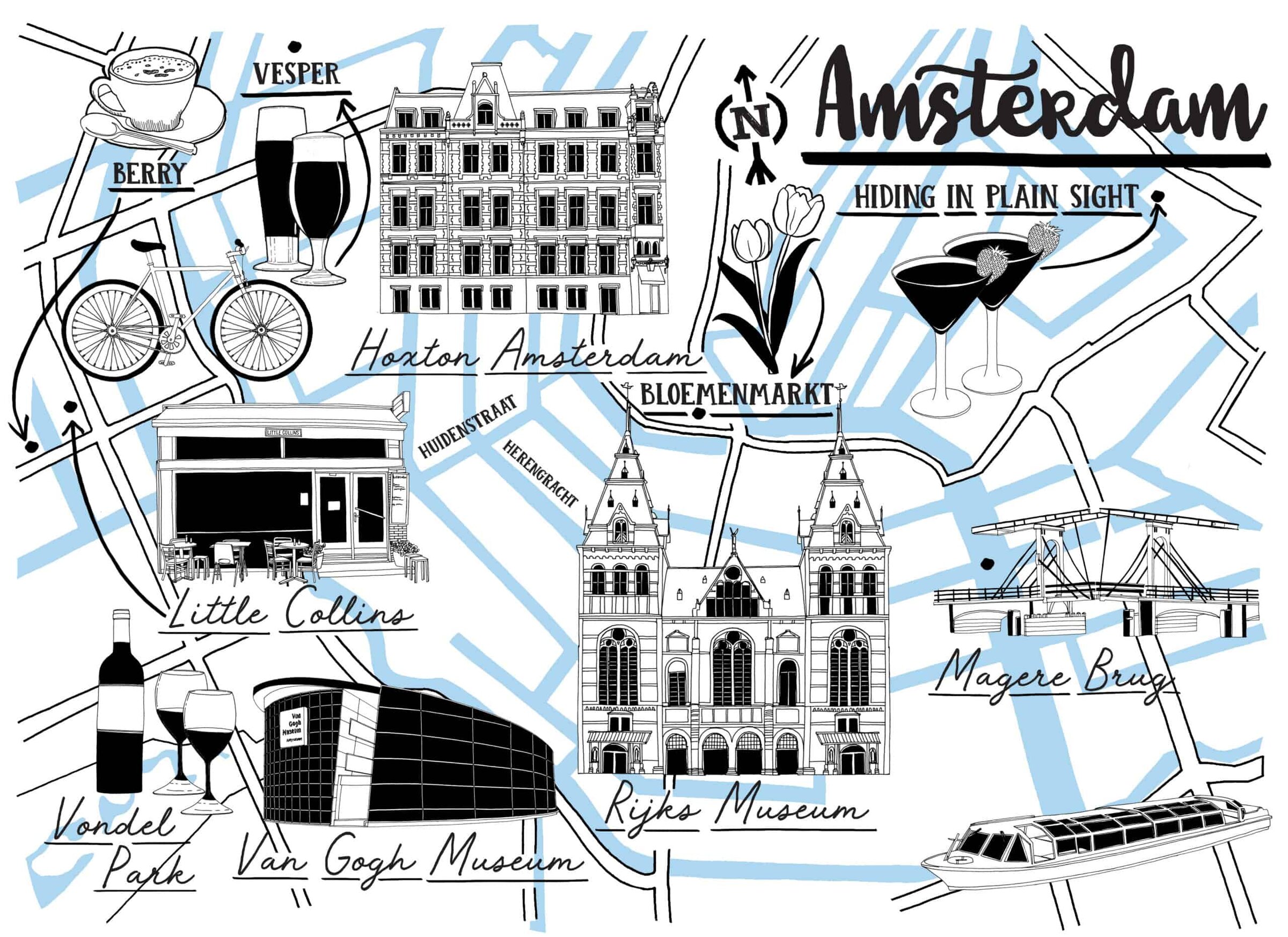 My personal illustration of the enchanting city of Amsterdam is a vibrant and whimsical map that captures the essence of this charming destination. At the heart of the map, I have depicted the iconic canals that wind their way through the city, serving as a navigational guide to the prominent landmarks and attractions.